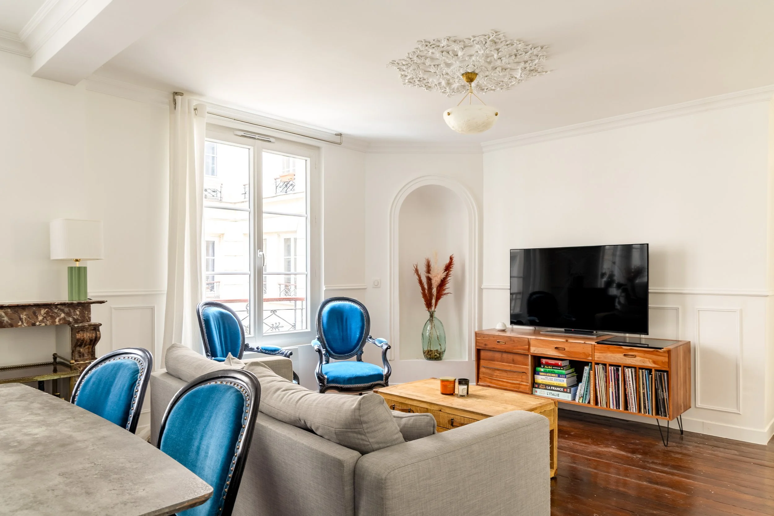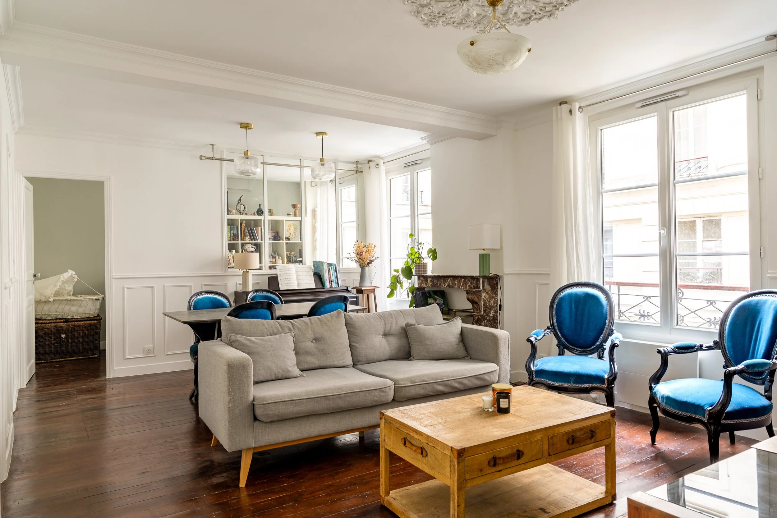 L’Atelier Studio Depommier a repensé les volumes, ouvert la cuisine et valorisé le caractère du lieu en restaurant le parquet d’origine et en restituant moulures et rosace selon les savoir-faire du Faubourg Saint-Antoine.