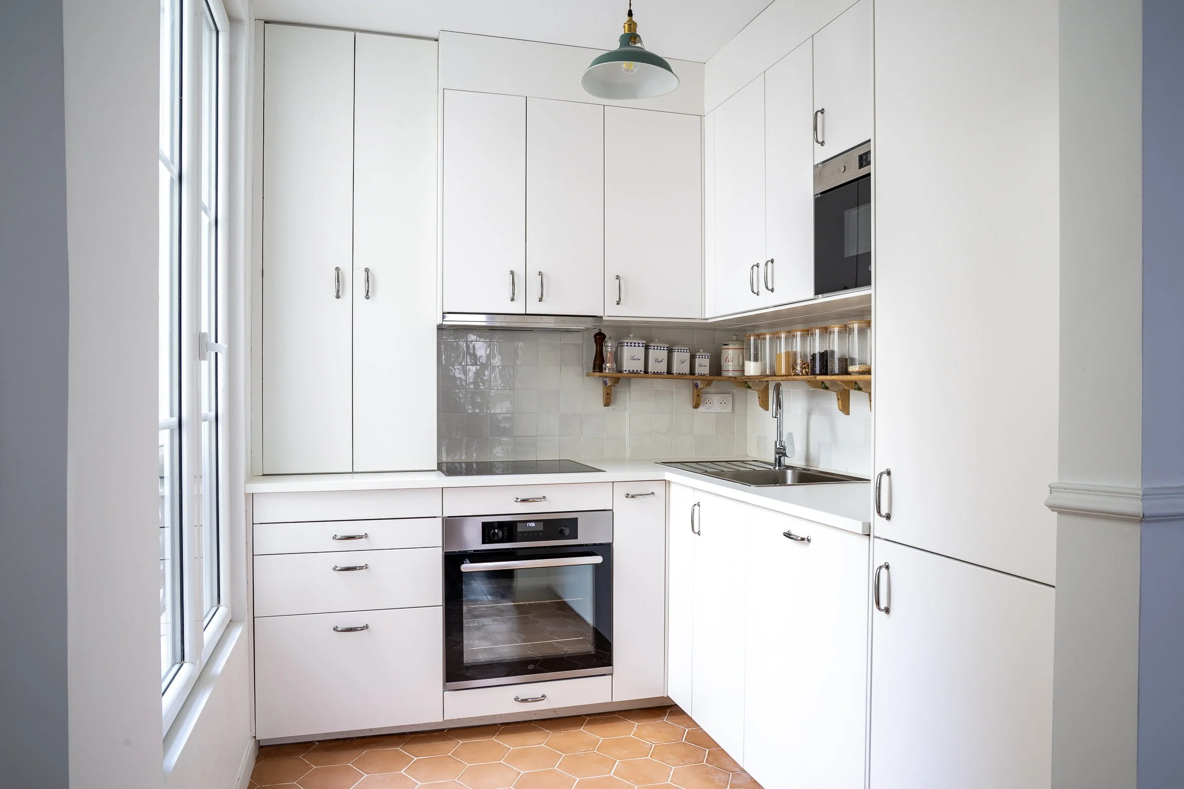 La cuisine a été entièrement repensée et ouverte partiellement afin d’optimiser les rangements tout en diffusant la lumière de la fenêtre vers l’ensemble de la grande pièce à vivre.