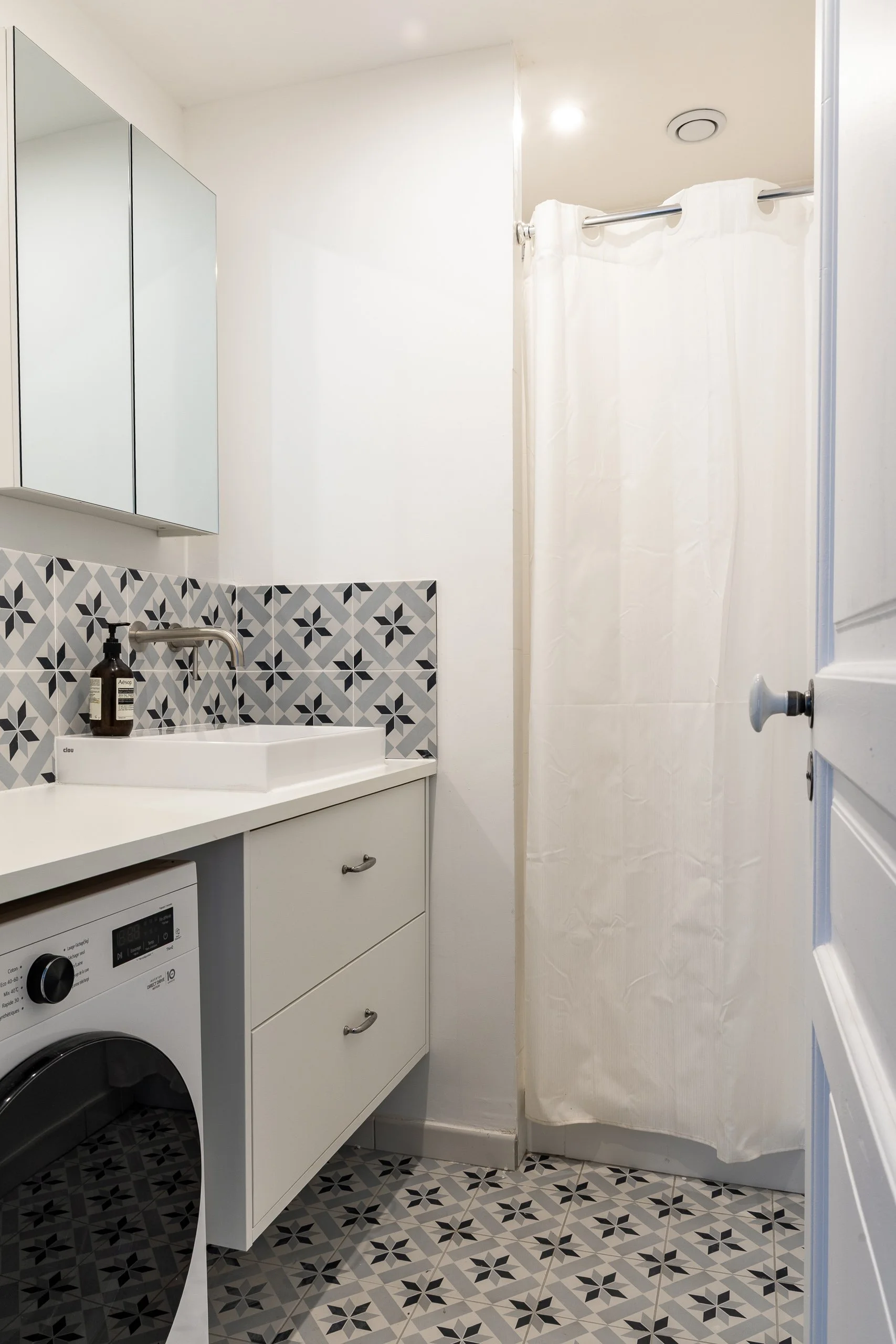 L’accès et l’agencement de la salle de douche ont été entièrement repensés pour permettre une entrée directe depuis la pièce à vivre, sans traverser une chambre ou la cuisine. Dans ce volume contraint, chaque centimètre a été optimisé. La vasque, issue du réemploi et reconditionnée, s’inscrit dans la démarche durable du projet.