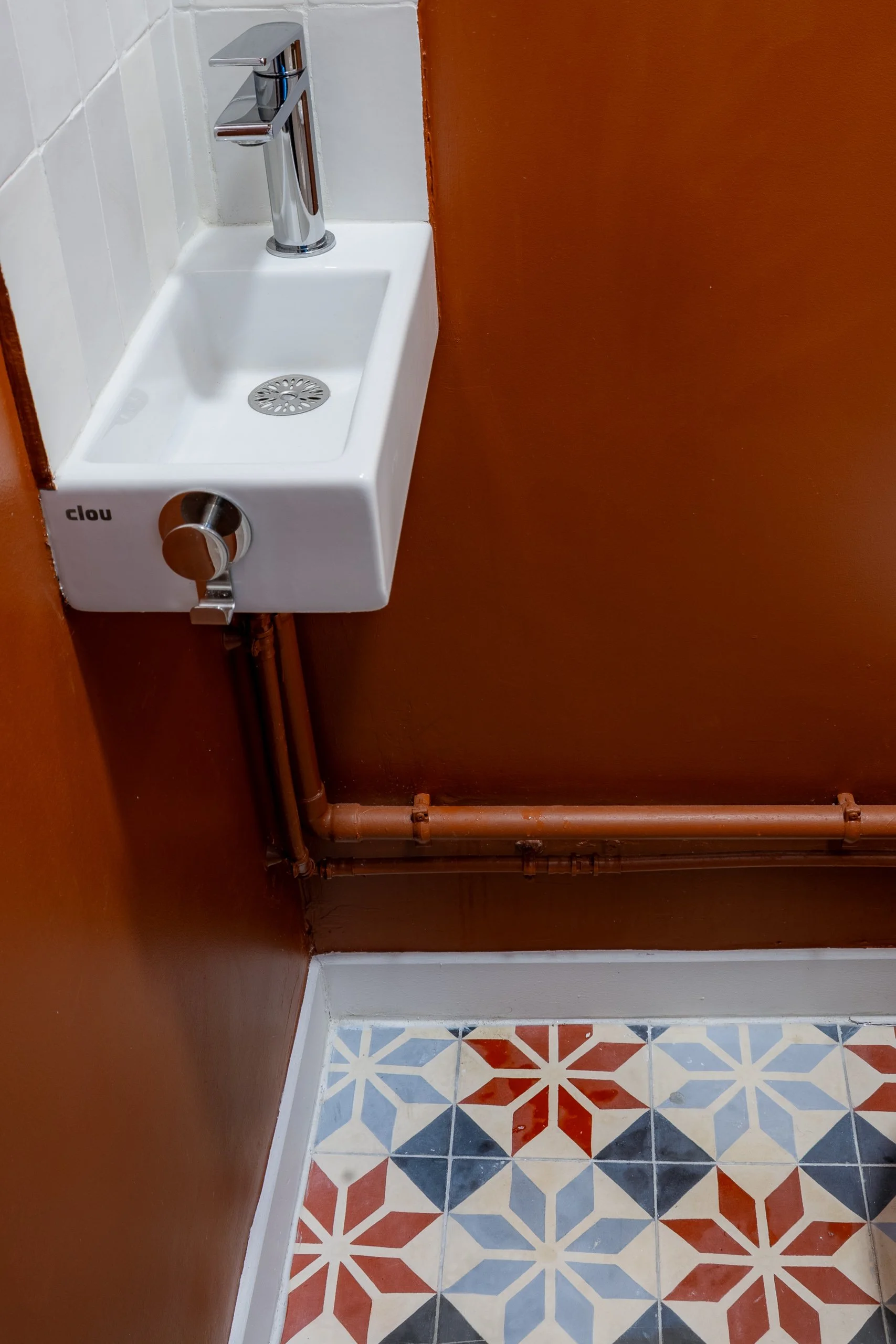 Les toilettes ont été rénovées en privilégiant les matériaux de réemploi : cuvette sur pieds et lave-mains reconditionnés, faïence murale issue du réemploi et carreaux de ciment artisanaux conçus pour restituer et compléter le motif d’origine mis au jour lors des travaux.