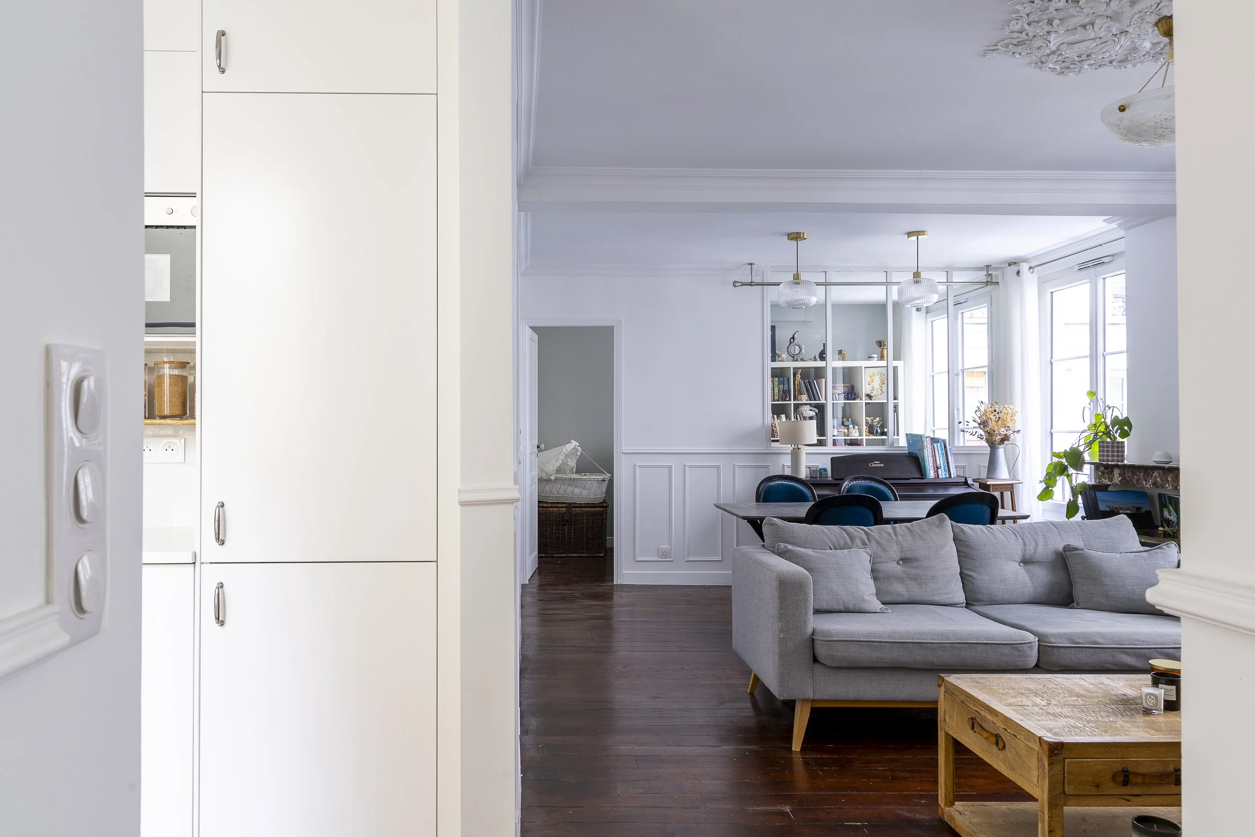 Pour optimiser la luminosité de cet appartement situé au premier étage sur cour, une verrière a été créée afin de diffuser la lumière naturelle provenant de la dernière fenêtre. La pièce à vivre bénéficie ainsi d’un éclairage plus généreux et homogène.